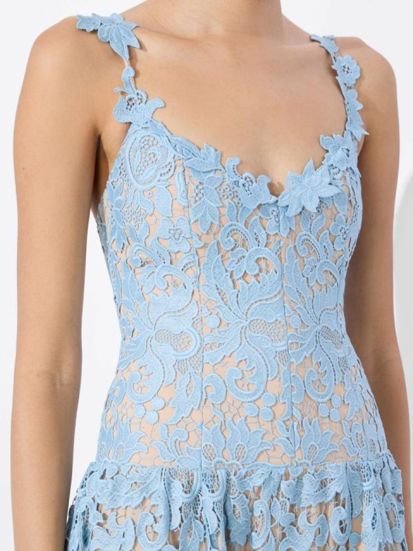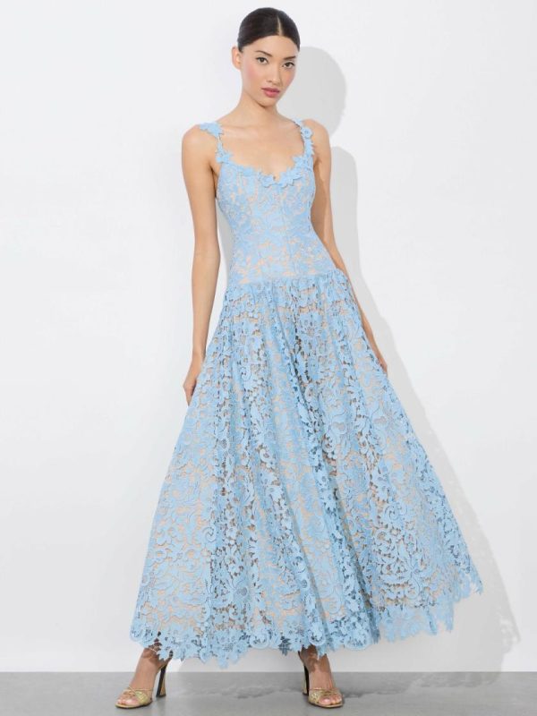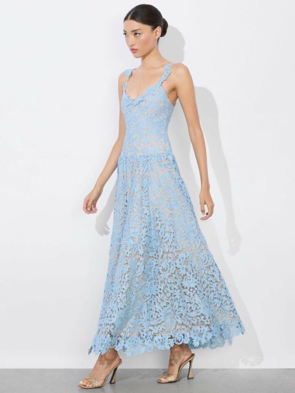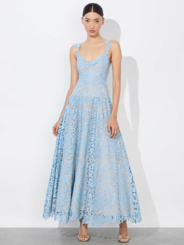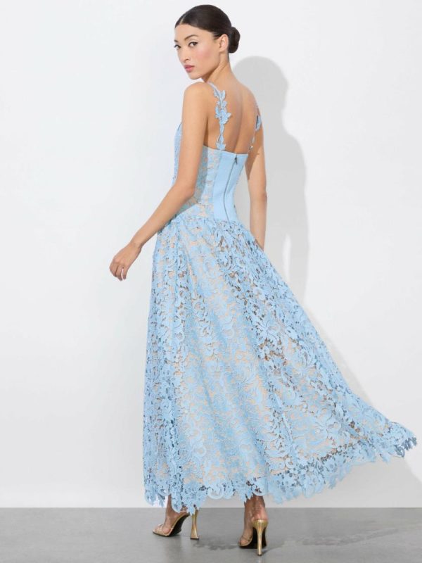Occasion dressing, perfected. Our Anabella midi drop waist dress is made from a romantic guipure lace with a nude backing for coverage. It has a torso-elongating top that plumes into a flared, swishy skirt. With a fitted bodice that hugs you in all the right places, this dress is ultra figure flattering. Wear it to your next big night out and, if you’re a bride, to a wedding-related festivity as your ‘something blue.’