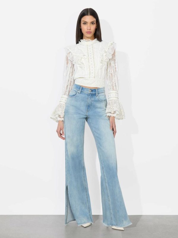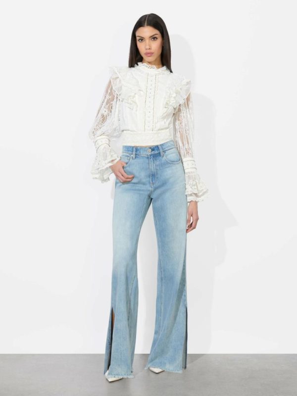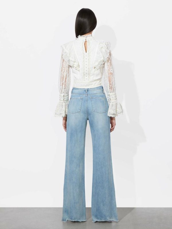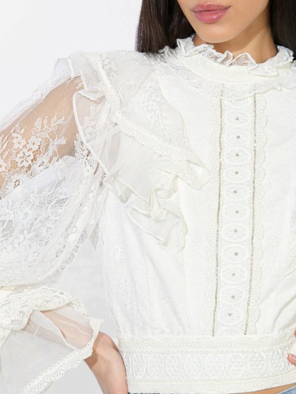 Romantic and statement-making, this cropped lace blouse blends bohemian elegance with modern femininity. Featuring intricate ruffled lace detailing along the bodice and shoulders, the semi-sheer fabric adds a delicate touch. A lined bodice allows for easy wear. The blouson sleeves, finished with dramatic ruffled cuffs, enhance the ethereal aesthetic. A fitted waist and high neckline create a structured contrast to the airy, textured lace, making this blouse a standout piece for elevated styling.