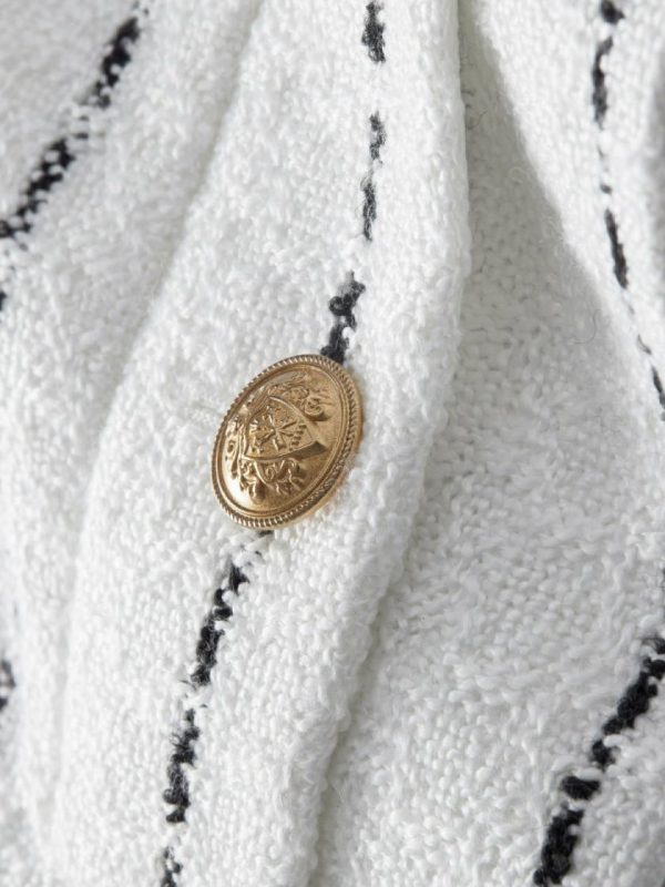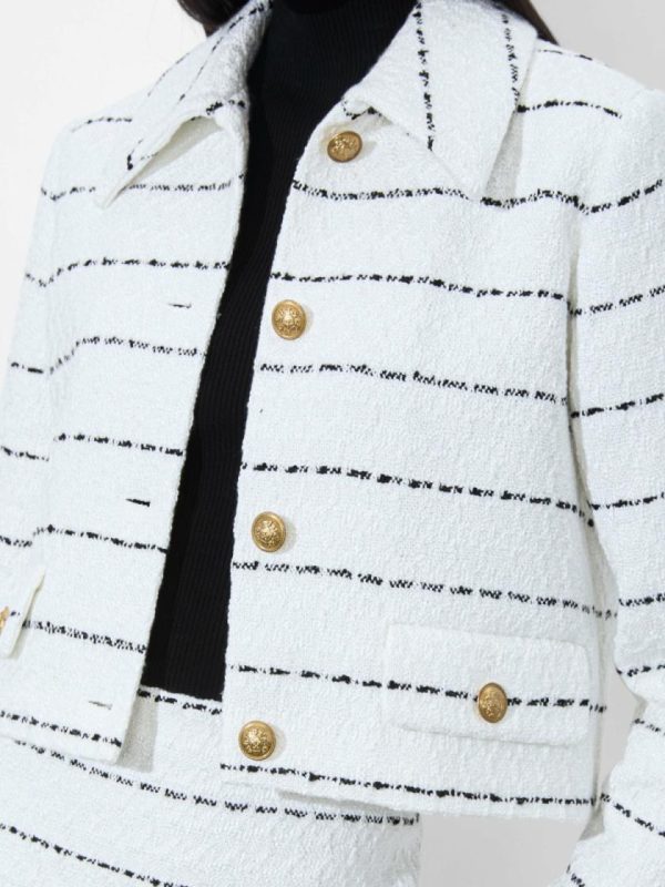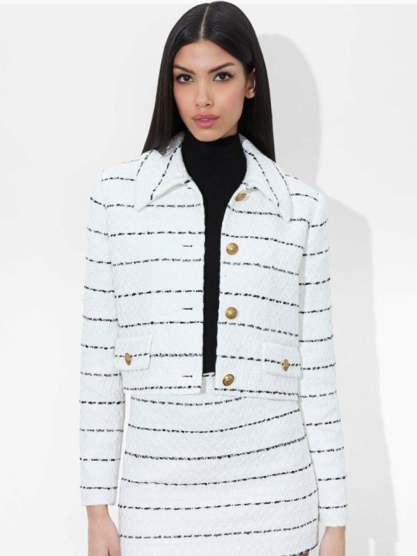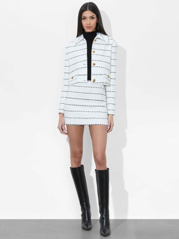 Major Blair Waldorf vibes. With a lightweight tweed construction, our Denyson is cut for a boxy fit with light shoulder pads for structure and bracelet-length sleeves. It’s slightly cropped and finished with a prim polo collar and two front patch pockets. A versatile addition to your closet, she can be worn with denim or paired back to her matching Elana Skirt.