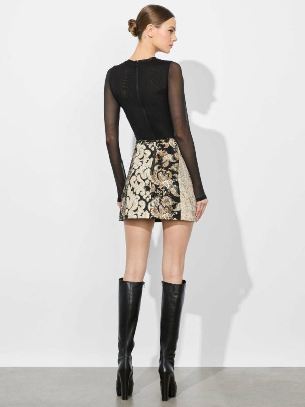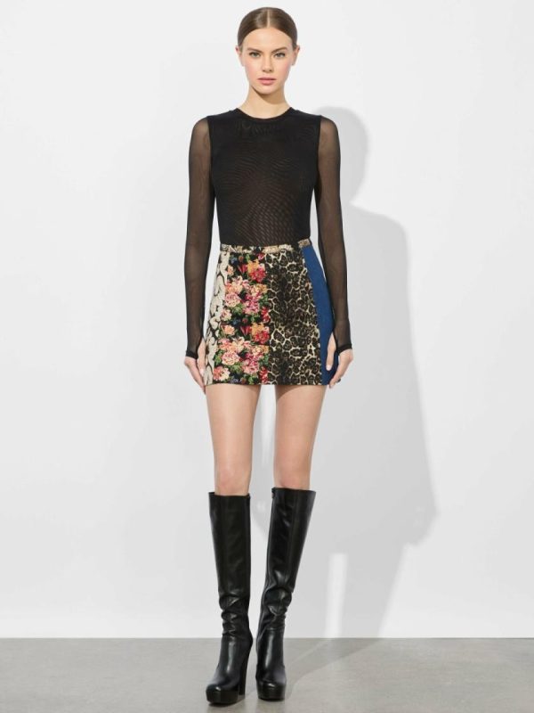 A maximalist power piece with a mini length, our Riley mixed media skirt has a unique look that we love. It’s made from premium denim and panels of floral, jacquard and leopard. A clean waistline and a back zipper closure ensure a smooth finish. Wear with knee-high boots and a neutral knit.